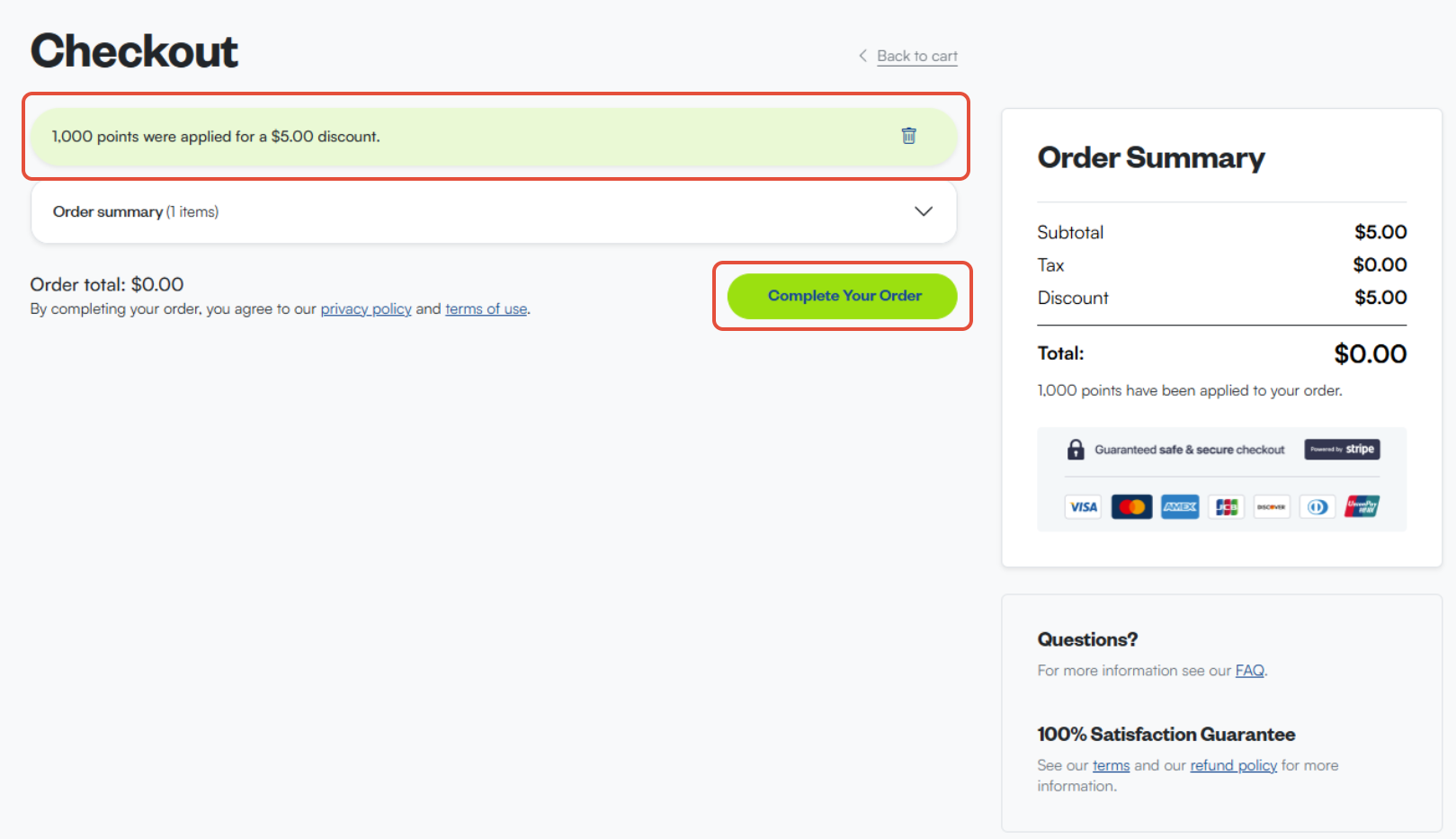 - At checkout, your points will automatically be applied if you have enough points to utilize in purchasing the deal(s). Once you've verified that your points have been applied, click on the "Complete Your Order" button.