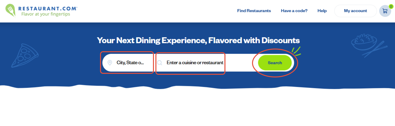 - On the "Find Restaurants" page, you can search for a list of restaurants by entering a City, State, or Zip Code. By default, the site will display results for the location you registered your account with. To change this, click on the default location and enter your desired City, State, or Zip Code, then click "Search."